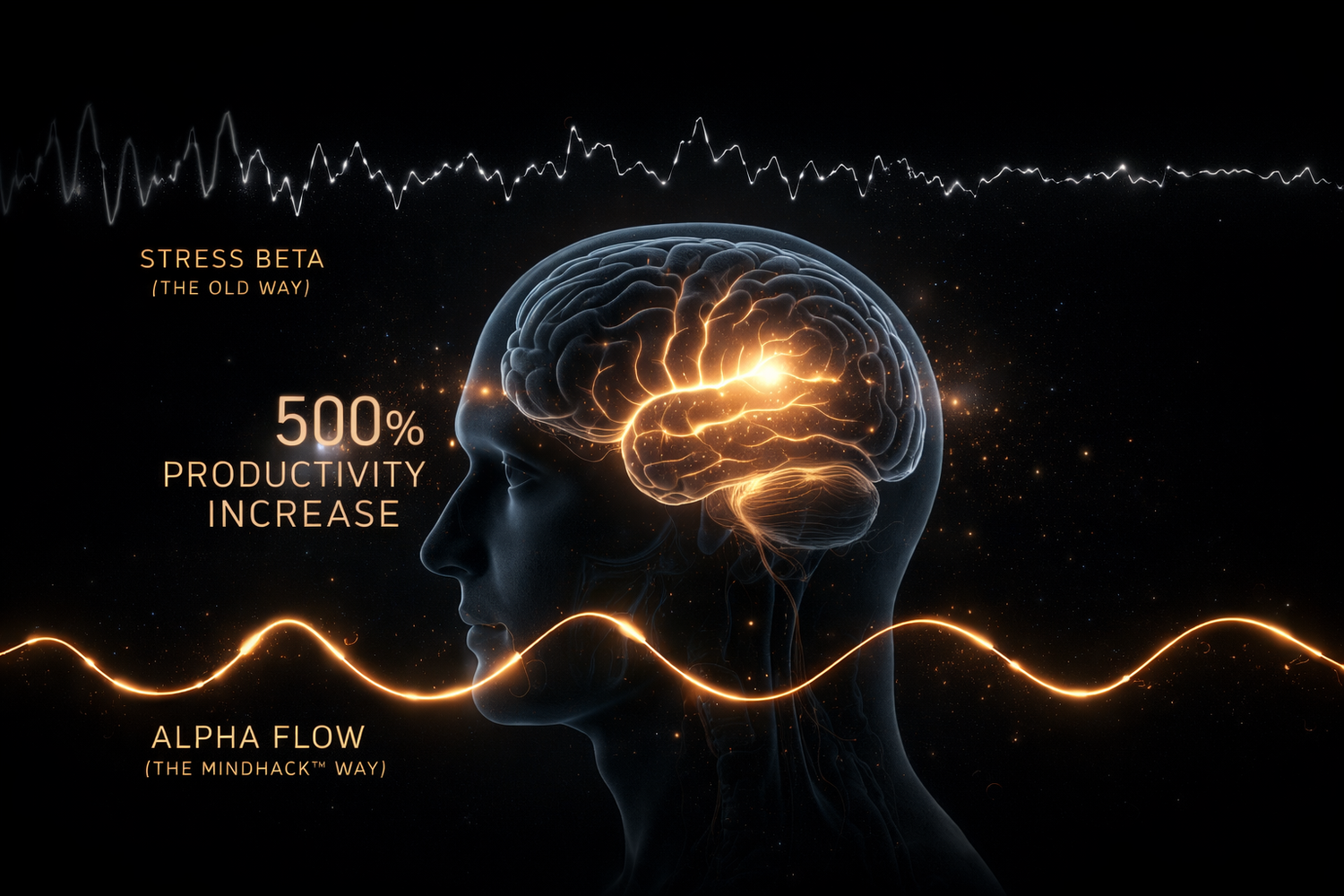 The problem? Most people spend their day in Beta Waves—the frequency of anxiety, distraction, and 'Brain Lock.' MINDHACK™ is engineered to bridge the gap. By inducing Alpha Brain Waves, we pull you out of the noise and into 'The Zone.'